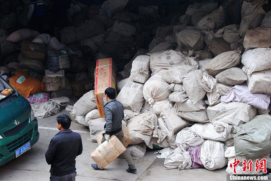 1月21日,貴州省威寧自治縣郵政局的工作人員在處理堆積如山的快遞包裹。隨著中國春節的臨近,為了避開實體店購物的擁擠和繁瑣,越來越多的人選擇網絡購置年貨,國內快遞行業也隨之迎來了“春運”高峰。此后的一段時間內,全國各家快遞公司的快遞員派送快件數量將大幅增加,部分快遞公司增加人員及時處理快遞包裹,確保盡快準確送到客戶手中。中新社發 秦風 攝 圖片來源:CNSPHOTO