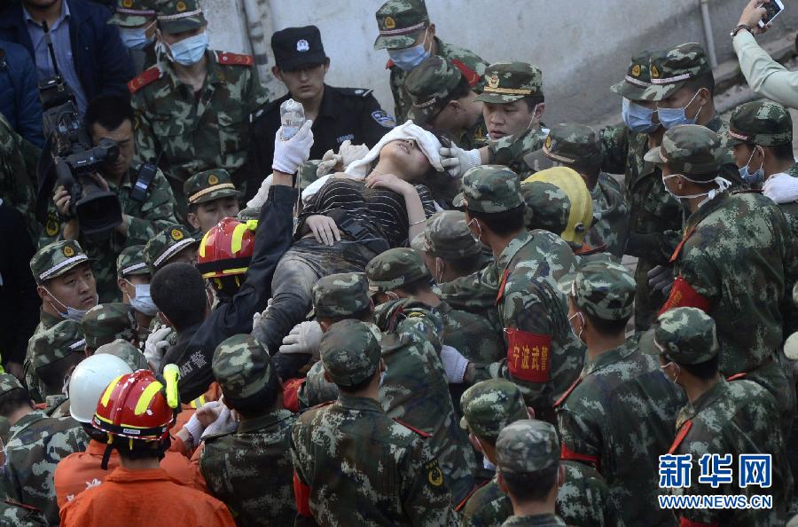 4月4日,救援人員將一名被埋壓的女子成功救出。當日17時50分,浙江省奉化市政府發布消息稱,第7名受困者成功救出,此前救出的1名傷者經搶救無效死亡。當日9時許,奉化市錦屏街道居敬小區第29幢居民住宅樓西側房子發生坍塌。新華社記者韓傳號攝