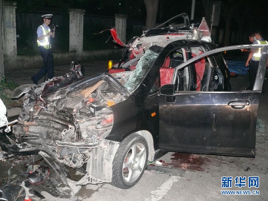 6月21日凌晨,深圳交警在小車碰撞大車致6人死亡的交通事故現場工作。據深圳交警通報,21日0時50分許,唐某某駕駛粵BF40U6號牌小車(載5名乘客)沿深圳南山區龍井路由西往東行駛至光前村路段時,與停止在路邊的大貨車發生碰撞,小車上6人當場死亡。據深圳交警初步調查,小車駕駛員涉嫌醉酒駕駛。