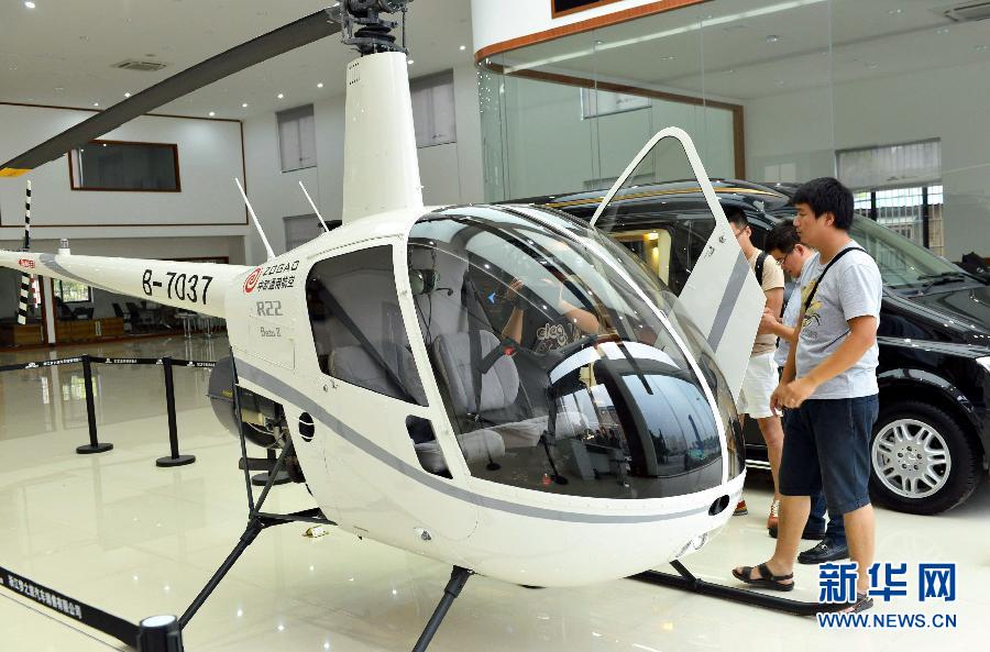 8月11日,市民在中歐飛機公司杭州展廳觀看美國羅賓遜公司生產的R22型單發直升機。近日,中歐飛機公司的杭州店投入使用,成為杭州首家正式銷售直升機的公司。據了解,目前在中歐飛機公司杭州展廳擺放的是美國羅賓遜公司生產的R22型單發直升機,銷售價格為近300萬元人民幣。新華社發(龍巍 攝)
