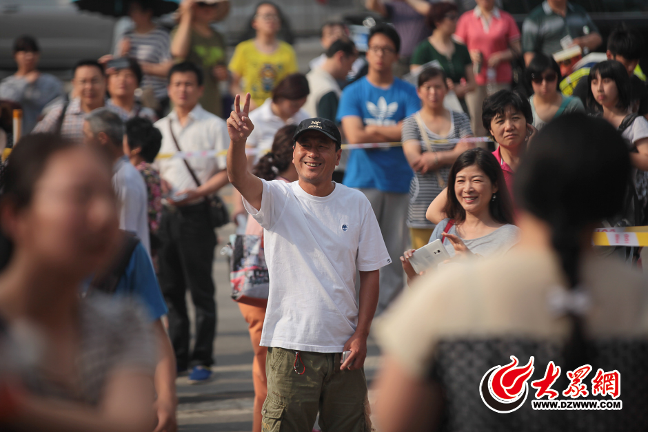 6月7日上午,高考第一天,山東省實驗中學考點外,一家長對考生做出勝利手勢。大眾網記者 王長坤 攝