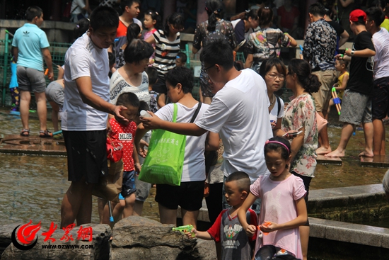 在這個不論到哪都熱的天氣里,不少市民選擇到護城河和泉池邊消夏避暑。10日中午,大眾網記者在趵突泉和五龍潭周邊看到,泉邊圍滿了前來消夏避暑的市民。五龍潭周邊的幾個小亭子和石凳上人滿為患,有不少市民甚至直接脫鞋進了水里,而孩子們則歡快地玩起了水槍。