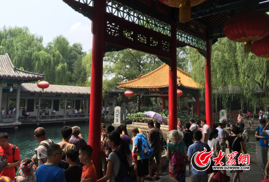 8月10日,在趵突泉畔、濼源堂前,不少游客排隊等著拍照。當日,趵突泉水位漲至28.00米,達到了28.00米橙色警戒線水位。大眾網記者 王長坤 攝