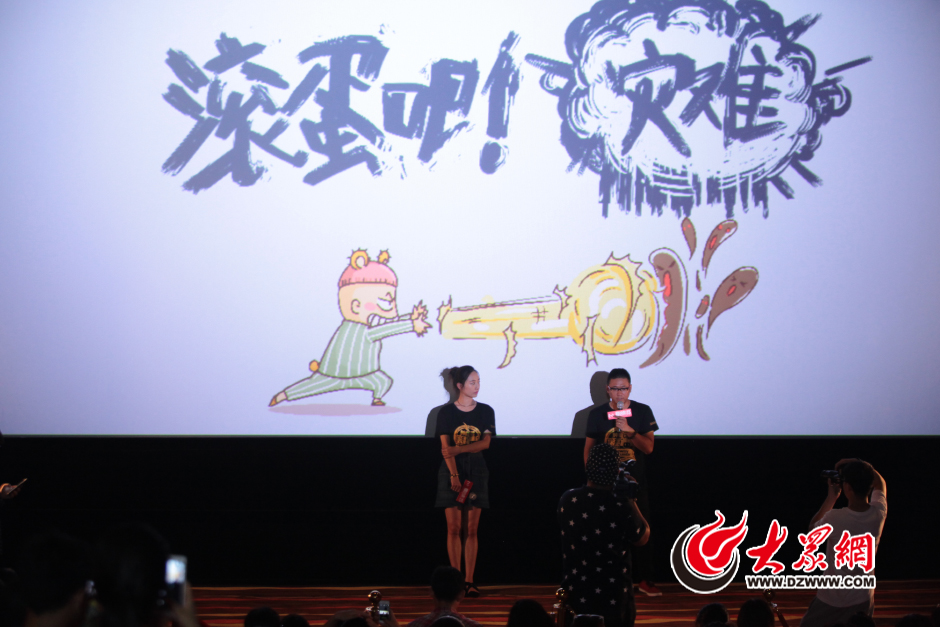 8月15日,電影《滾蛋吧!腫瘤君》導(dǎo)演韓延、主演白百何來到濟(jì)南為電影宣傳。白百何和韓延身穿黑色主題T恤亮相,因?yàn)樘旖蛱凉帘ㄊ录鬓k方把背景板換成了《滾蛋吧!災(zāi)難》。