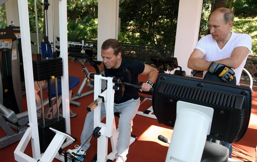 當地時間2015年8月30日,俄羅斯索契,俄總統普京與總理梅德韋杰夫在健身館內練習器械。
