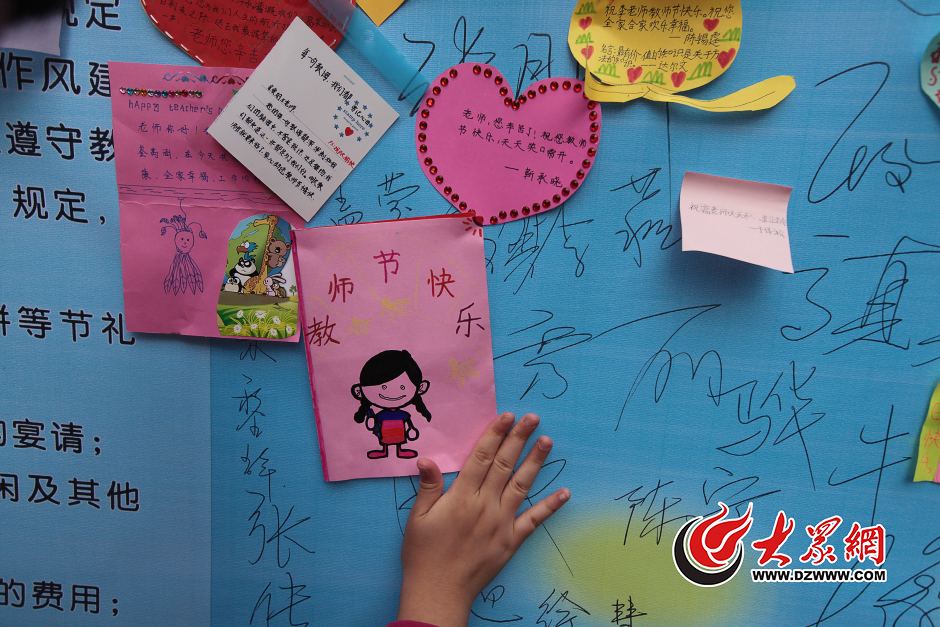 2015年9月10日,全國第31個(gè)教師節(jié),在山東師大附小校園里,2600名學(xué)生將寫有寄語的卡片貼滿了祝福墻。 一張張寄語卡片、一份份祝福凝聚了學(xué)生對老師深深的感激。大眾網(wǎng)記者 王長坤 攝