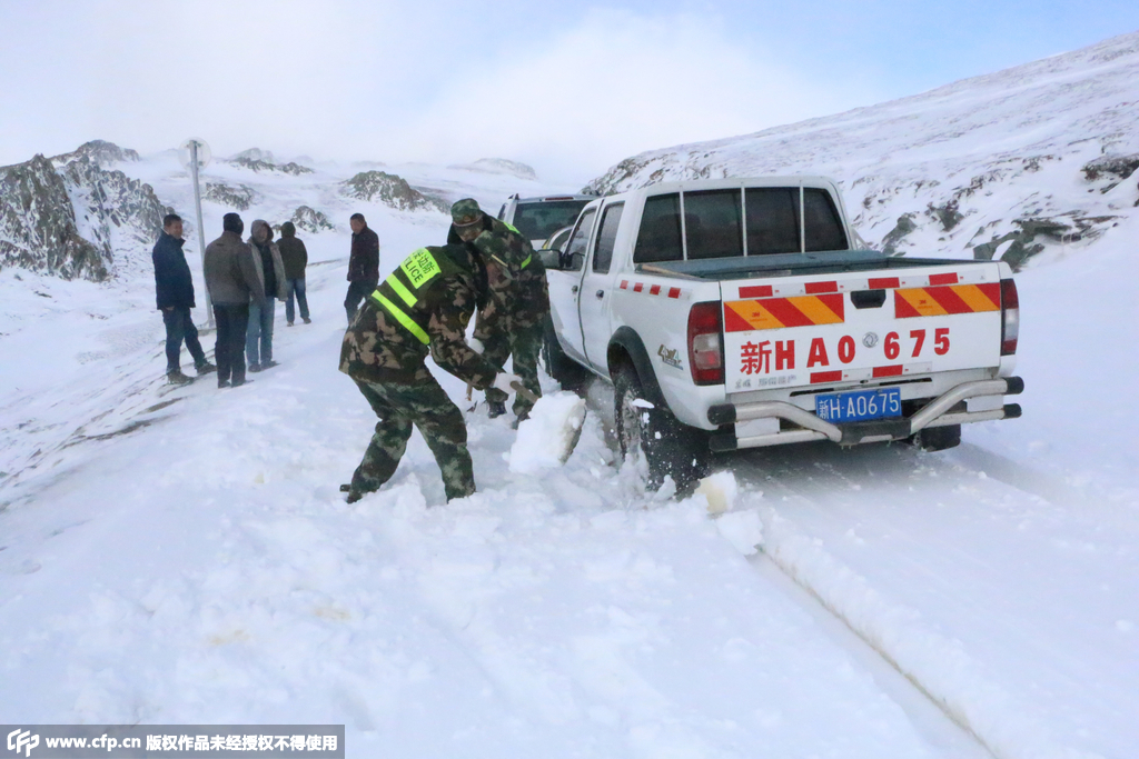 2015年9月22日,新疆阿勒泰,紅山嘴到阿勒泰過往路段突降暴雪,降雪厚達到25厘米,導致部分車輛受困。 邊防官兵對受困車輛開展救援。