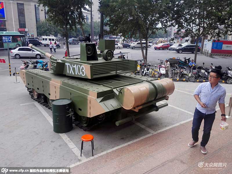 2015年09月28日,河南省鄭州市,紫荊山路街頭,一組霸氣的山寨版“武裝直升機”和“坦克”引來不少路人圍觀。據(jù)知情者稱,原來這是臨街一珠寶商家,為打造國慶氣氛,專程運來組裝的,“坦克”和“武裝直升機”均為鐵皮等比例仿真打造,雖說是山寨版,但乍一看去,橫據(jù)街頭很是威猛霸氣。