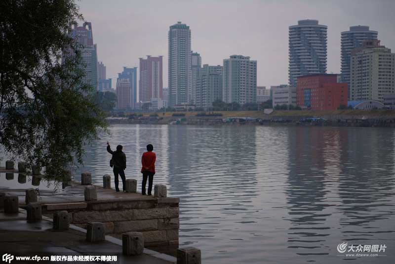 當地時間2015年10月10日,朝鮮平壤,兩名男子站在大同江旁。朝鮮勞動黨迎來成立70周年紀念日。
