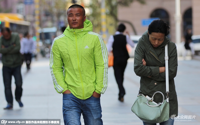 2015年10月10日,青島,寒露到來之后,北方地區(qū)的溫差明顯增大,青島市區(qū)最低氣溫已降至7.1℃-12.9℃,并伴有5-6級大風(fēng),市民紛紛身著秋裝出行以躲避寒潮襲擊,上演一場乍寒還暖、美麗“凍”人的亂穿衣景象。