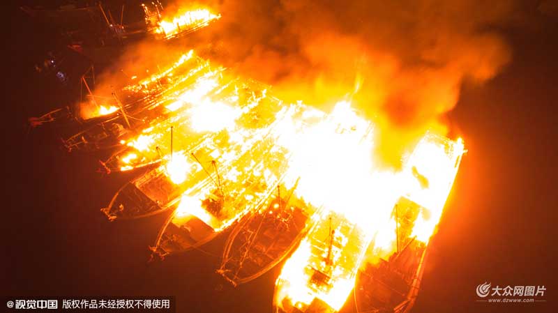 由于事發(fā)凌晨,船上的漁民已返回家中,故火災(zāi)未造成人員傷亡。據(jù)統(tǒng)計,共有8艘漁船和1艘漁排被嚴(yán)重?zé)龤В碛袃伤覞O船燒毀程度較輕。至于起火原因,據(jù)初步了解,事發(fā)時正值農(nóng)歷初一,當(dāng)?shù)厝藭M行一些拜祭活動,或因所燒紙錢飛到船內(nèi)引發(fā)火災(zāi),目前具體原因仍在調(diào)查中。