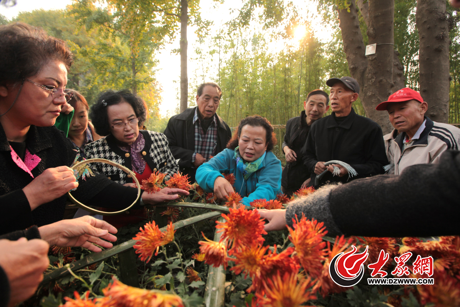 11月4日,濟南趵突泉景區萬竹園門口小廣場上,不少人圍在一株大立菊盆栽前忙碌著。當日,天下第一泉趵突泉景區舉辦大立菊扎制體驗活動,20余名市民游客在養菊能手劉淑芹的指導下,用一上午時間共同扎制了一組大立菊作品。大眾網記者 王長坤 攝
