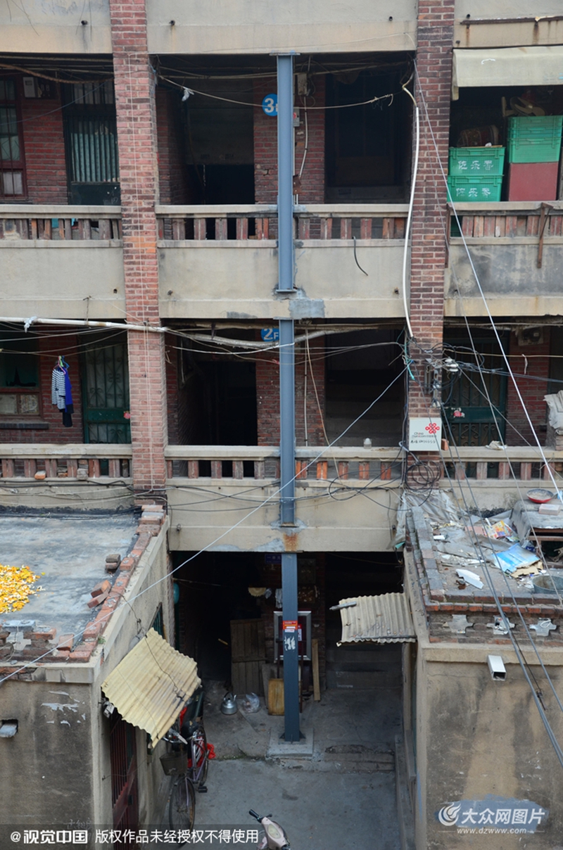 2015年11月4日,濟南,一小區內兩棟樓前豎立的鋼板格外顯眼,破舊的四層老房子靠鋼板苦苦支撐著,被附近居民戲稱為“樓堅強”。據了解,該老樓已經有50多年的歷史了,而鋼板已經有十余載了,僅在半年前加固過。