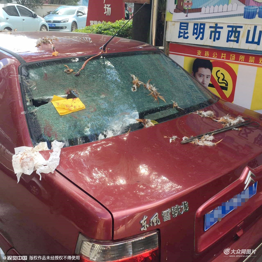 2015年11月5日,昆明一男子車被砸,無奈之下,王先生選在自己生日的今天,在車前點香火、車身粘紙錢、掛著“詛咒牌”詛咒砸車人。