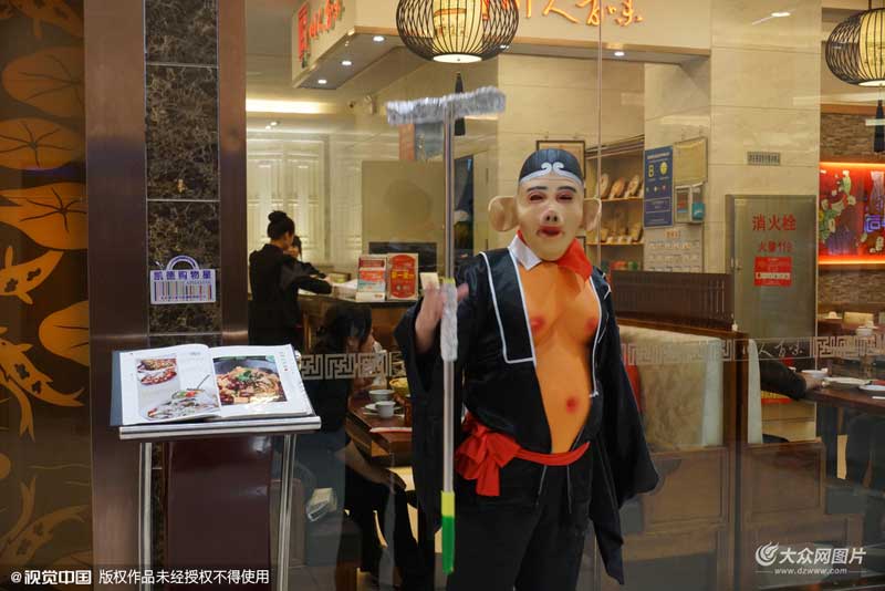 2015年11月17日,位于遼寧大連和平廣場的一家川菜館為攬客出“奇招”,工作人員裝扮成豬八戒,扛起釘耙道具在店門前賣力吆喝拉客,吸引食客注意。