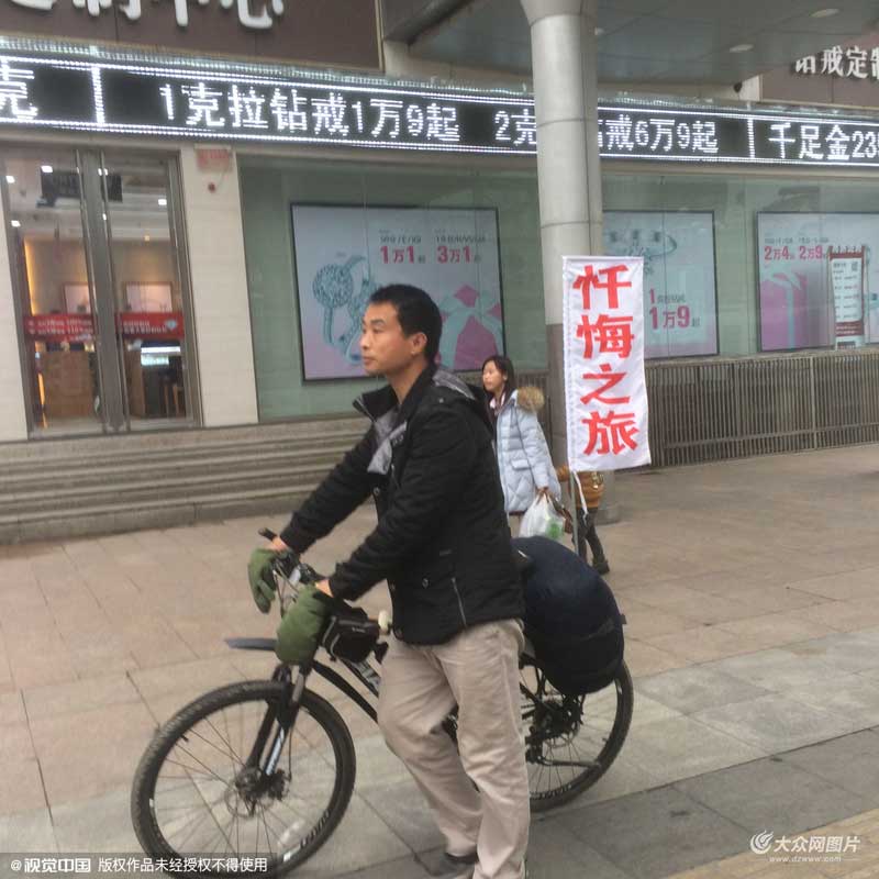 “大家要敬畏法律,與人為善。”昨日上午,在二七廣場,一名身穿黑衣的中年男子講述著自己的故事,與圍觀市民交談著。男子身旁停著一輛山地自行車,自行車的車把上固定著一雙軍綠色棉手套。車后座上綁著一個帆布包袱,車身上插著一面旗子。白色的旗子上寫著四個大紅字“懺悔之旅”。不少好奇的市民詢問旗子上四個字是什么意思。男子向大家講述了自己的經歷。