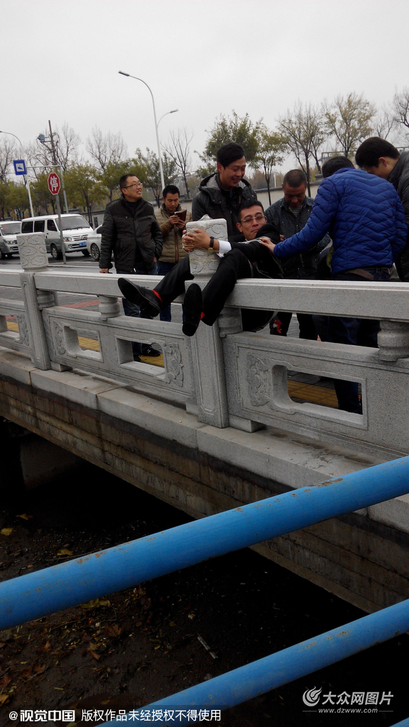 2015年11月23日,近日,在山東淄博周村區,一名新郎被人用膠帶捆在橋上,并且屁股上掛上燃放的鞭炮,吸引眾多路人駐足觀望。