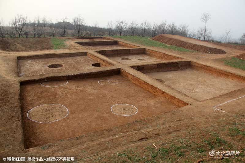 而令人驚奇的是,在“中”字形旁邊,密集地分布著3排21個大小相同的神秘圓坑。這些圓坑整齊地排成三列,每個直徑約1.5-2米,但坑里并沒有發現任何遺存,里面的土分為三層。孫偉剛說,起初以為是柱洞,但卻發現沒有炭灰以及其他任何東西,因此推測可能是祭祀坑。在古代對先祖墳墓的祭祀,有一種方式叫血祭,拿動物的血肉進行祭祀,祭完了以后,經過幾千年這些血肉腐朽之后不會留下任何遺跡。