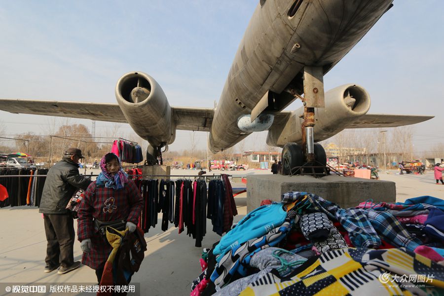 2015年12月12日,山東省濱州市博興縣灣頭村,傳統的民間集市,停放了兩架從中國空軍退役的轟-5轟炸機。
