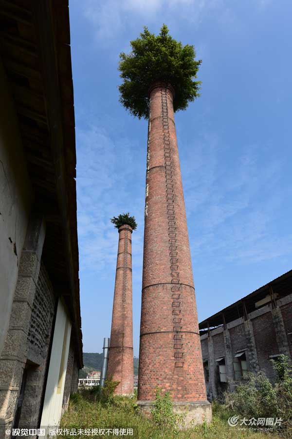 在泉港區涂嶺鎮下爐村,原“地方國營惠安糖廠”的兩根幾十米高的煙囪頂上竟然長出了茂盛的榕樹,完全把煙囪排煙口封起來了,遠處看仿佛戴了個“綠帽子”。