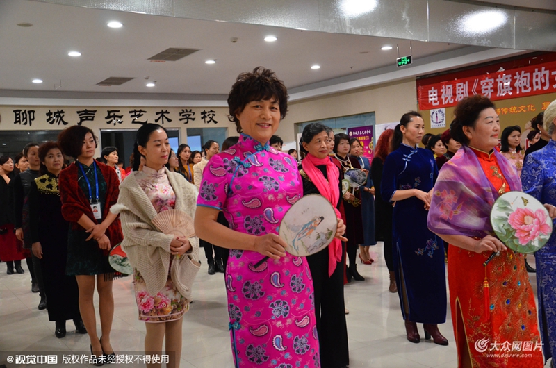 2015年12月16日,山東聊城某商場(chǎng)內(nèi),不少身著靚麗旗袍的阿姨參加培訓(xùn)。