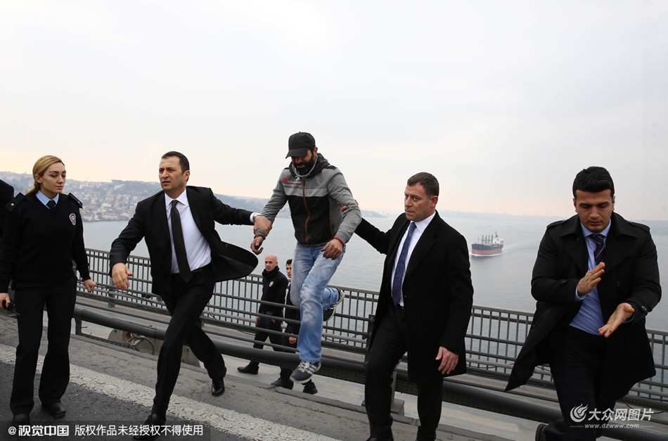 當地時間2015年12月25日,土耳其伊斯坦布爾,一名男子原本想在博斯普魯斯大橋上跳河自殺,被總統(tǒng)埃爾多安的保鏢勸阻。