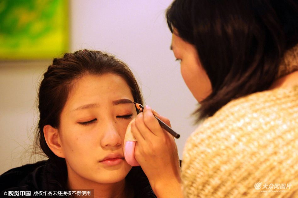 2015年12月26日,山東青島,中國國際互聯網時尚設計大賽決賽在山東青島東方時尚中心舉行,10名進入決賽的模特T臺演繹獲獎時尚服裝。攝影師獲準進入模特化妝間和休息室拍攝了一組模特的臺后生活,記錄下模特T臺光鮮背后的苦樂生活。化妝間的中外模特認真聽從配合化妝師的安排,精心化好各自臺妝。休息室內模特在等待上臺時以玩手機為主,消磨時間,有的模特干脆在沙發上小憩一番。兩名韓國模特在洗手間也不忘對著鏡子查看一下自己的臺妝,還與初次合作的中國模特合影、嬉戲。