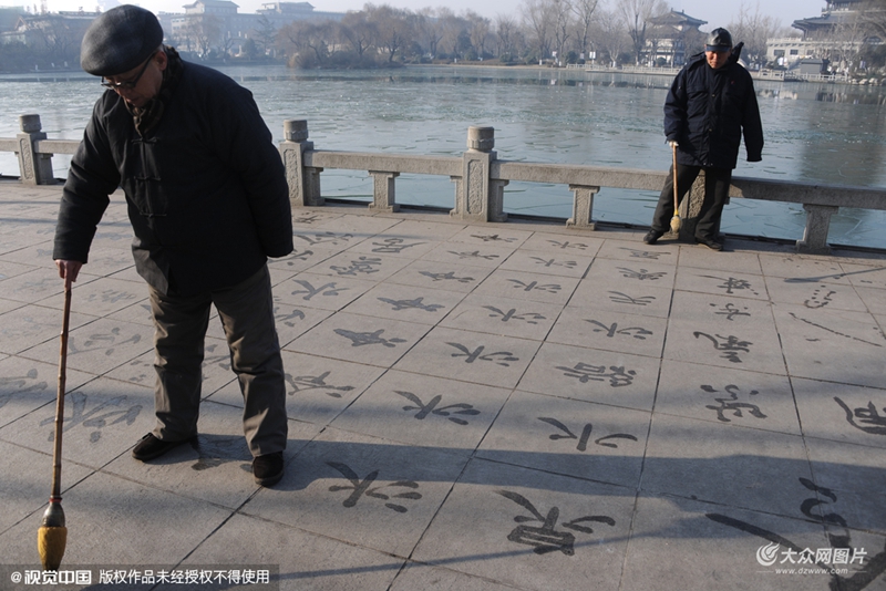 2016年1月19日,濟(jì)南大明湖景區(qū)新景區(qū),大爺在零下13度左右的天氣里,用毛筆在地面寫(xiě)滿“冷”字。