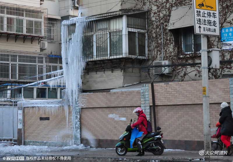 2016年01月24日,山東省濟(jì)南市,連續(xù)的極寒天氣造成某小區(qū)三樓住戶水管凍裂,水沿排水管排出,造成冰掛,街邊道路結(jié)冰,影響路人通行。