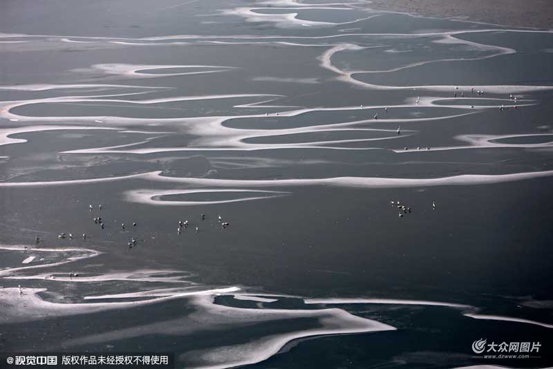 2016年1月26日,山西運城,受極寒天氣影響,黃河山西平陸段出現大面積結冰。從空中俯瞰,冰層猶如蜿蜒曲折的白色絲帶浮于河面,夕陽照射,“白色精靈”點綴,宛如精美的印象山水畫。
