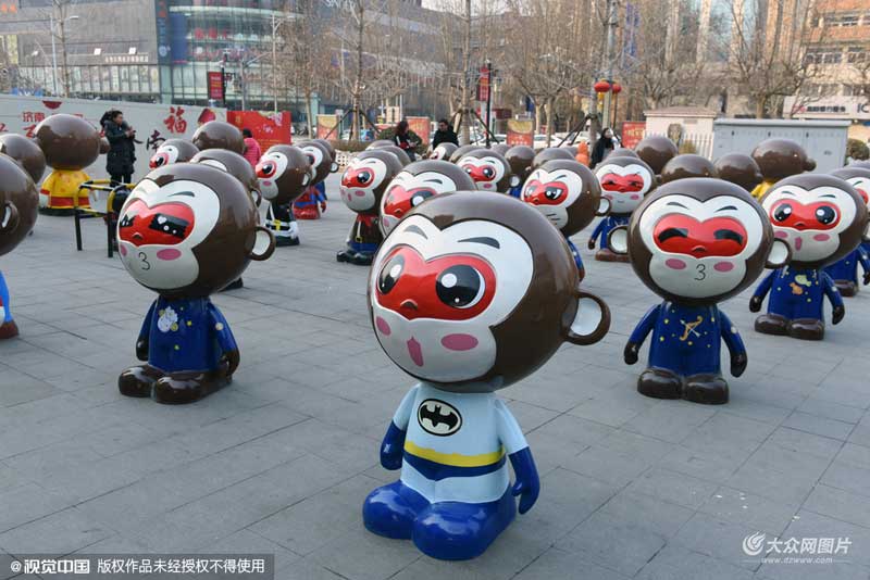 1月29日,濟(jì)南泉城路世茂廣場(chǎng)門(mén)前,72只孫悟空卡通形象集體亮相,七十二變鬧新春,成為街頭一道風(fēng)景線,市民游客紛紛駐足合影留念。