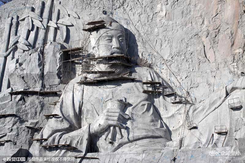 2016年2月6日,湖北省襄陽市,在一處廢棄采石場上雕刻的孟浩然和其經典五言古詩《春曉》將環(huán)境保護與文化藝術很好的結合起來。