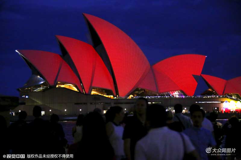 當地時間2016年2月6日,澳大利亞悉尼,悉尼歌劇院點亮紅光迎接中國農歷新年。