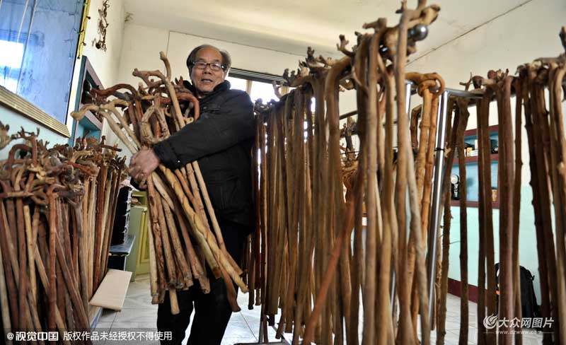 2016年2月16日,安徽省合肥市巢湖市柘皋鎮,張邦元與他制作的千根根藝拐杖。