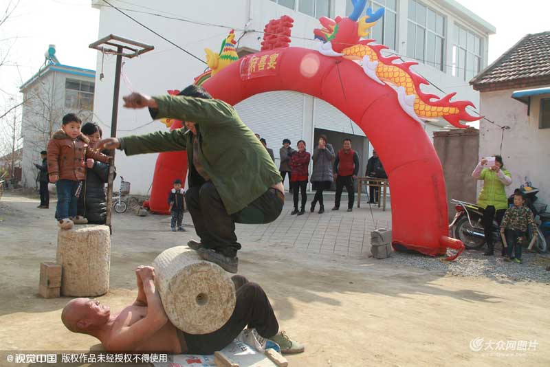 結婚成家之后,妻子對他癡迷于氣功很不贊成,始終埋怨他不務正業,凈弄閑情。因此經常不給他洗衣服,有時候也不做飯給他吃。出于對妻子的尊重和包容,劉杰不得不將功夫“撂荒”了。圖為劉杰把石磙自搬到自己的肚皮上,伸出赤膊壓在大石條下面,任人掄起大錘將石條夯斷。一個偶然的事件,給劉杰的功夫帶來了轉機。2008年,有位村民被人欺負躲進了他的家中。面對門外氣勢洶洶的十多人,他的妻子出于本能仗義執言說了幾句“抱不平”,竟然遭到了來者的蠻橫圍毆。為了保護妻子,他憤而出迎,將圍毆者一眾人等逼退。他的氣功本領就此得到了妻子的默認,隨之也在鄉鄰中傳揚開來。圖為劉杰表演“硬氣功”,雙手撐地直立。 據村支書介紹,近年來,劉杰的“硬氣功達人秀”已經成為村民們喜聞樂見的娛樂項目之一,每到節慶期間,他都得在家門口“撂場子”耍上幾遭,深得鄉鄰的期待和好評。