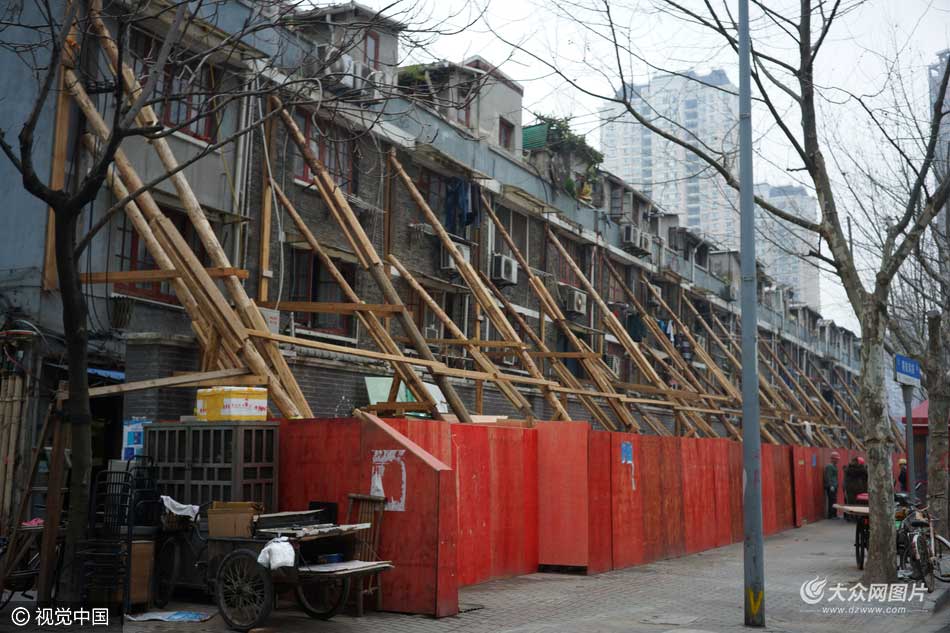 2016年3月13日,上海黃浦區(qū),黃陂南路永年路一石庫門舊里房屋發(fā)生傾斜開裂,外墻用數(shù)十根木棒進(jìn)行加固,場面十分壯觀,不少路人走過都加快了腳步。據(jù)了解,此處房屋開裂傾斜是由于相隔一條馬路的兩個(gè)建筑工地野蠻施工造成。此段居民小區(qū)為上世紀(jì)20年代建成的磚木結(jié)構(gòu)石庫門建筑,房齡至今已經(jīng)90余年,受影響的居民就多達(dá)幾十戶。