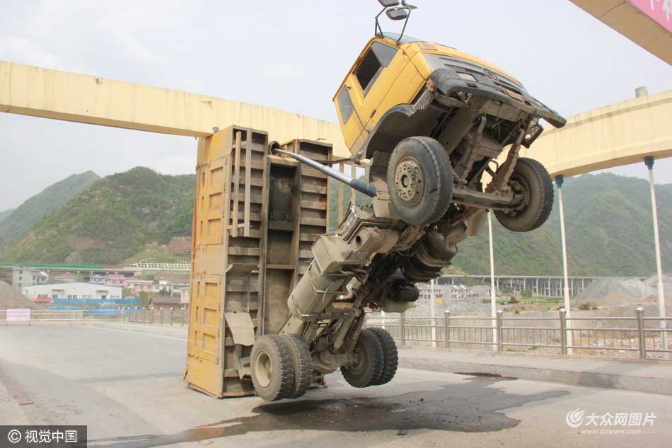 4月12日14時許,陜西安康安平高速平利西出口引線彩虹橋上,一名司機行駛中忘將自卸卡車翻斗放下,導致自卸翻斗卡在大橋拱頂橫梁,前輪部分騰空抬起,司機受輕傷。