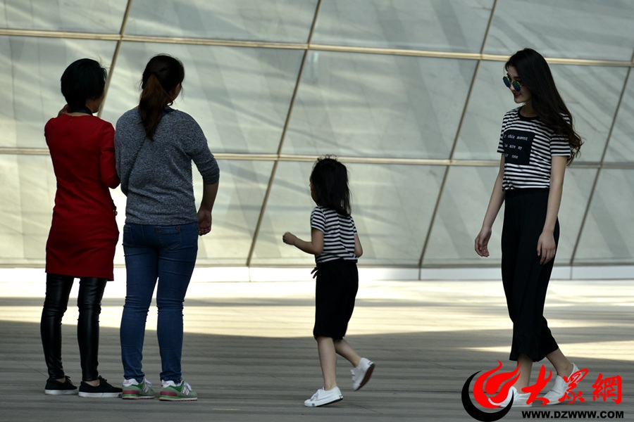 2016年4月15日,濟(jì)南最高氣溫達(dá)到29攝氏度,母子兩人穿著清涼外出游玩。記者 孫博洋攝
