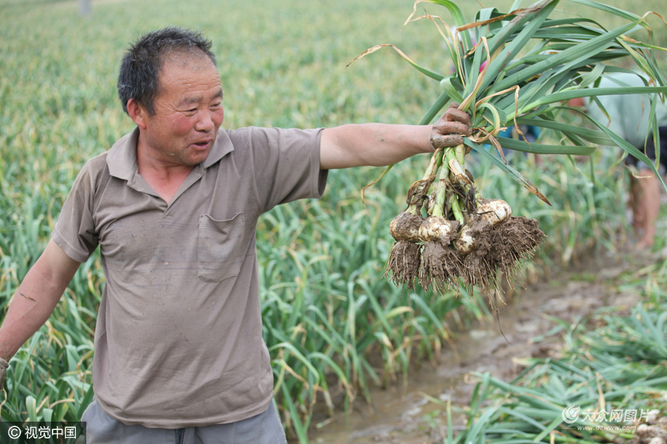 2016年5月9日,在山東省臨沂市平邑縣溫水鎮梭莊村,村民在忙碌著收獲新蒜。