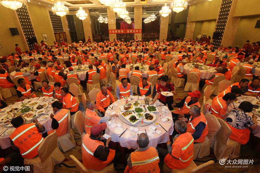 2016年6月4日,山東省濱州市,土豪愛心企業邀請環衛工人在當地一家五星級酒店進行聚餐活動,場面相當震撼。據了解,這家土豪企業已經不是第一次搞這樣的慈善活動了,僅最近參加過這個聚餐的環衛工人就已經超過千人。
