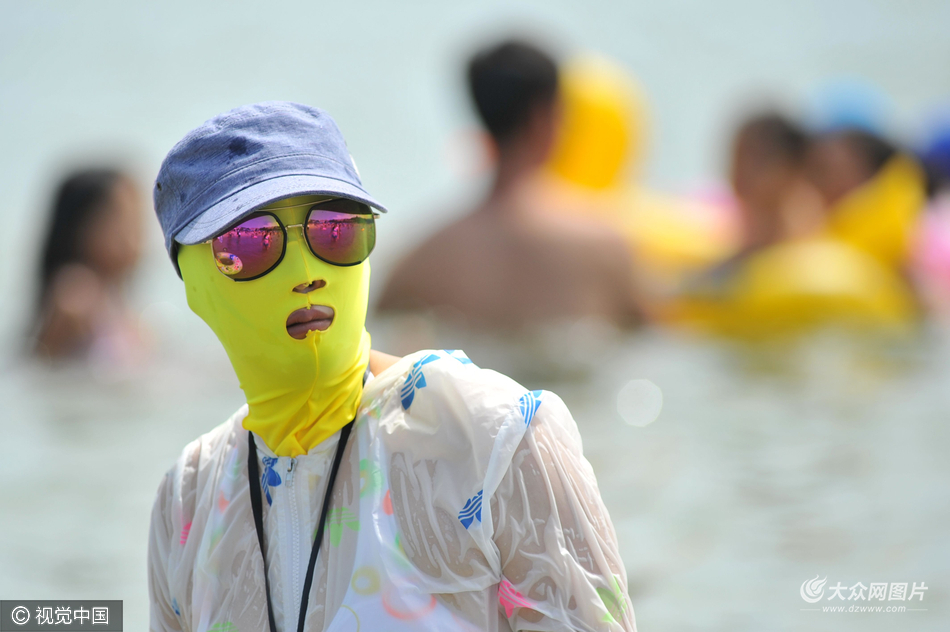 2016年8月16日,山東省青島市,高溫熱浪席卷沿海地區,連日來市區最高氣溫一直維持在32℃—35℃,也是海蜇高發期季節,穿帶防曬防海蜇神器的“臉基尼”大媽采取最好的防護措施,扎堆出現在海水浴場,游客避之不及,更有小朋友被嚇得大哭。