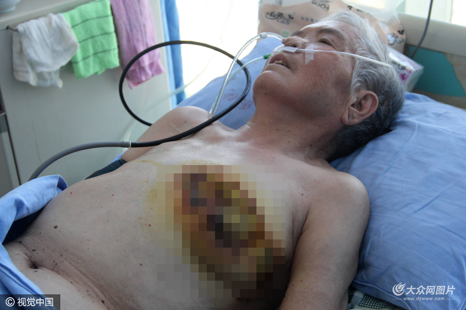 2016年8月29日,山東東營,76歲的于愛英老人在東營市人民醫院接受治療,身上多處受傷。日前,老人遭到兒子兒媳虐待,左側乳房被用烙鐵燙傷。