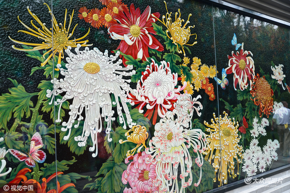 2016年9月7日訊,成都市百年名園人民公園菊園門口現(xiàn)浮雕漆畫百菊圖,畫長7米,高逾2米,由成都藝術(shù)家王懿創(chuàng)作。王懿將木版畫、烙畫、壁畫和雕漆結(jié)合起來,歷時(shí)三個(gè)月創(chuàng)作出該浮雕漆畫。畫面上的菊花品種有芙蓉托桂、帥旗、龍爪等,很多都是四川的特色名種。