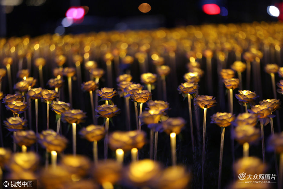 9月17日,山東省青島市唐島灣海濱公園,由5萬朵紅、黃玫瑰花燈組成的光之玫瑰花燈海在這個中秋悄然綻放,為這個中秋節(jié)增添了許多浪漫氣氛,引來許多市民,特別是情侶前來游玩。