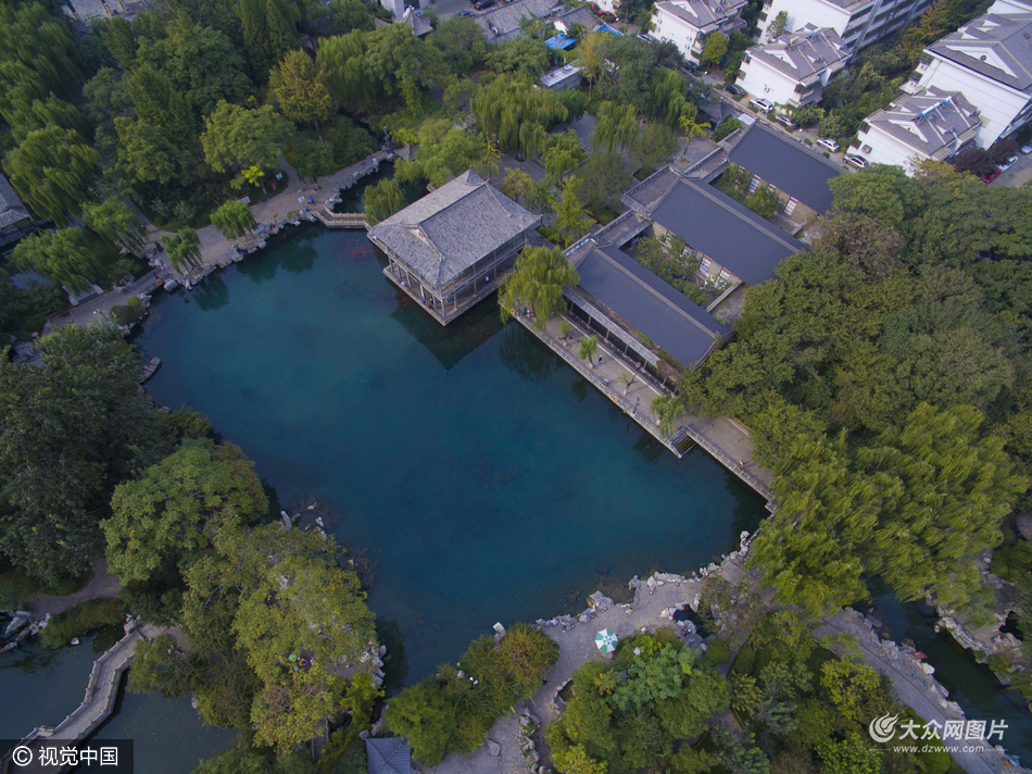 2016年09月24日,山東省濟南市,航拍趵突泉、五龍潭公園“泉源上奮,水涌若輪”,泉池幽深波光水影交相輝映,曲廊環繞,院院相通,樓、堂、亭、廡參差錯落,環境清幽,景色宜人,構成了一幅奇妙的人間仙境圖。
