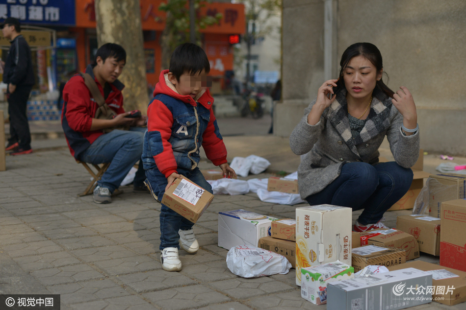 2016年11月13日,山東省濟南市,雙十一購物快遞襲來 缺人手!全家齊上陣。在濟南市山師校園內,雙十一購物后的快遞高峰到達,由于快遞件數普遍較往日翻2~3倍,不少公司員工加派人手應對,更有全家總動員、齊上陣的景象出現,保證派件有條不紊,萬無一失。