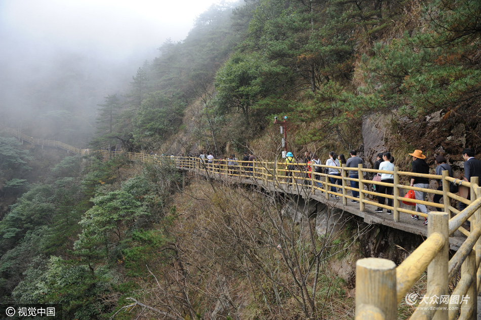 2016年11月19日,江西宜春,明月山棧道云霧中穿行驚險(xiǎn)刺激。