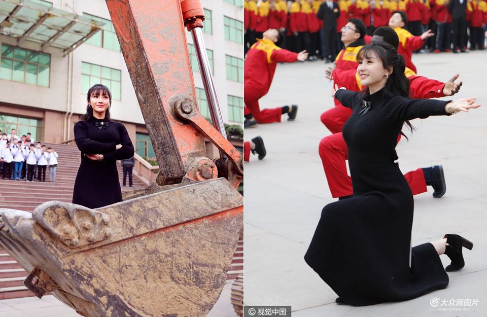 12月11日,柳巖一身露背黑長(zhǎng)裙空降山東藍(lán)翔高級(jí)技工學(xué)校,為宣傳主演電影《大鬧天竺》豁出膽玩很high。