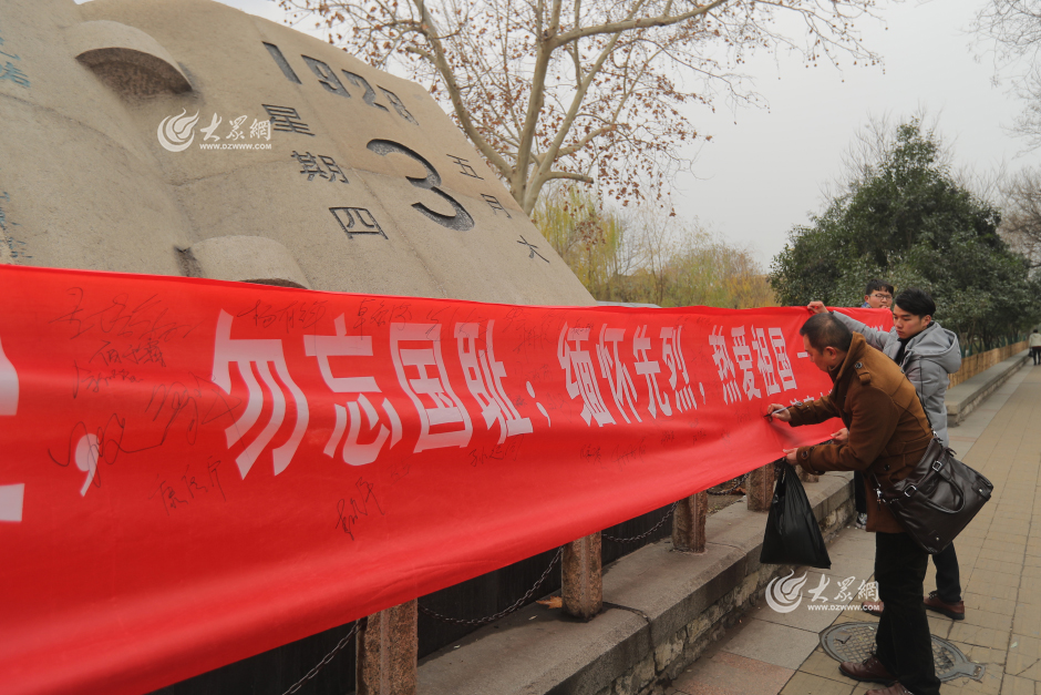 12月13日是南京大屠殺死難者國家公祭日,山東濟南,來自濟南大學的20多名學生自發聚集在濟南慘案紀念碑前,拉開印有“銘記歷史、勿忘國恥、緬懷先烈、熱愛祖國”的橫幅,組織紀念活動,眾多學生、路過的市民紛紛主動上前簽名,緬懷先烈,銘記歷史。大眾網記者 王長坤 攝
