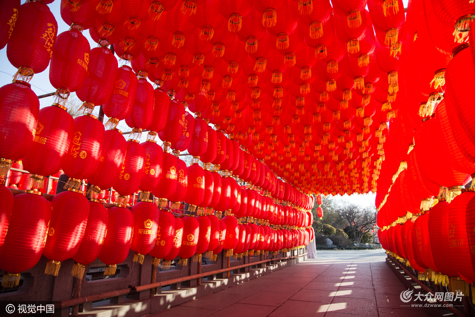2017年01月22日,濟(jì)南,為了迎接2017新年的到來(lái),臘月二十五一早,大明湖景區(qū)內(nèi)出現(xiàn)一條十幾米長(zhǎng)的燈籠陣,左右和頭頂都是小紅燈籠,紅紅火火甚是喜人,也為節(jié)日增添喜慶氣氛。